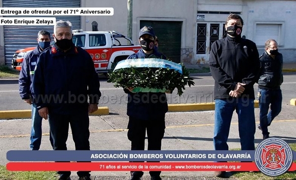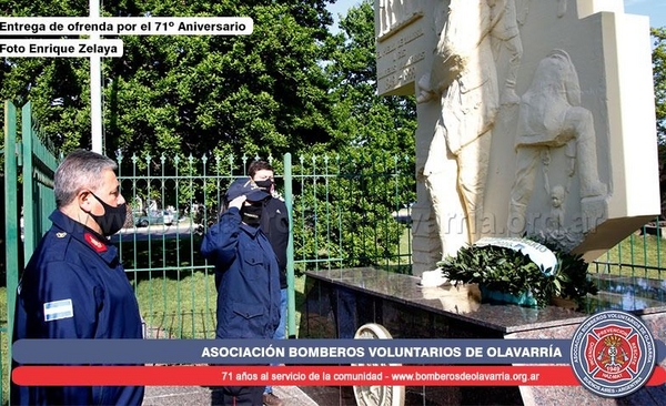 os Bomberos Voluntarios de Olavarría celebraron este viernes su 71º aniversario de una manera especial debido al contexto de Aislamiento Social, Preventivo y Obligatorio. En el Parque del Bicentenario y respetando las medidas de distanciamiento, colocaron una ofrenda floral en el monumento que se encuentra en el lugar. Participaron del acto, el Jefe del cuerpo Cdte. Gral. Raúl Ferreira y el presidente del Concejo de la Asociación, Ricardo Luiggi.