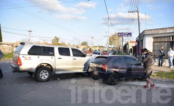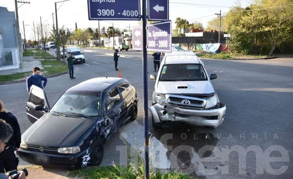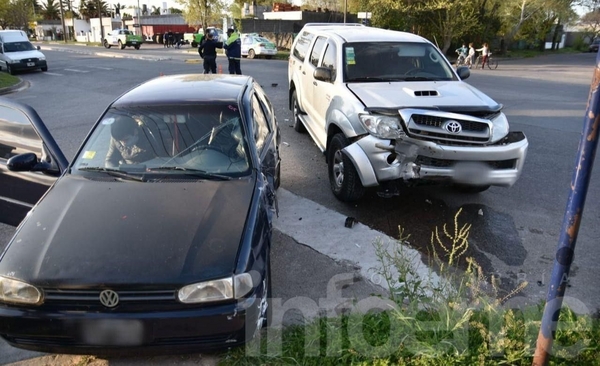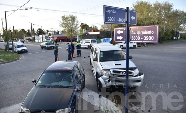 Cerca de las 18 de este viernes se produjo el siniestro en la intersección de la avenida Sarmiento y Laprida entre una camioneta Toyota Hilux y un Volkswagen Gol. Producto del hecho, la conductora del auto debió ser traslada al Hospital Municipal “Dr. Héctor Cura”.