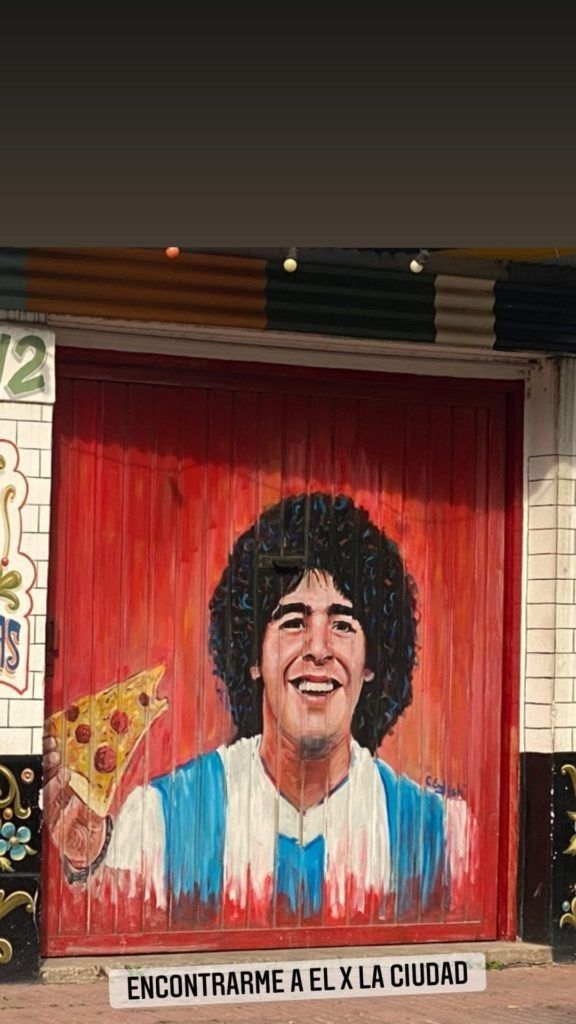Gianinna Maradona subió a sus historias de Instagram una foto de un mural callejero en el que aparece una de las icónicas imágenes de Maradona. "Encontrarme a él por la ciudad", escribió Gianinna debajo de un dibujo de un Diego juvenil, con la camiseta de la Selección Argentina y la melena llena de rulos. En la mano, una porción de pizza.