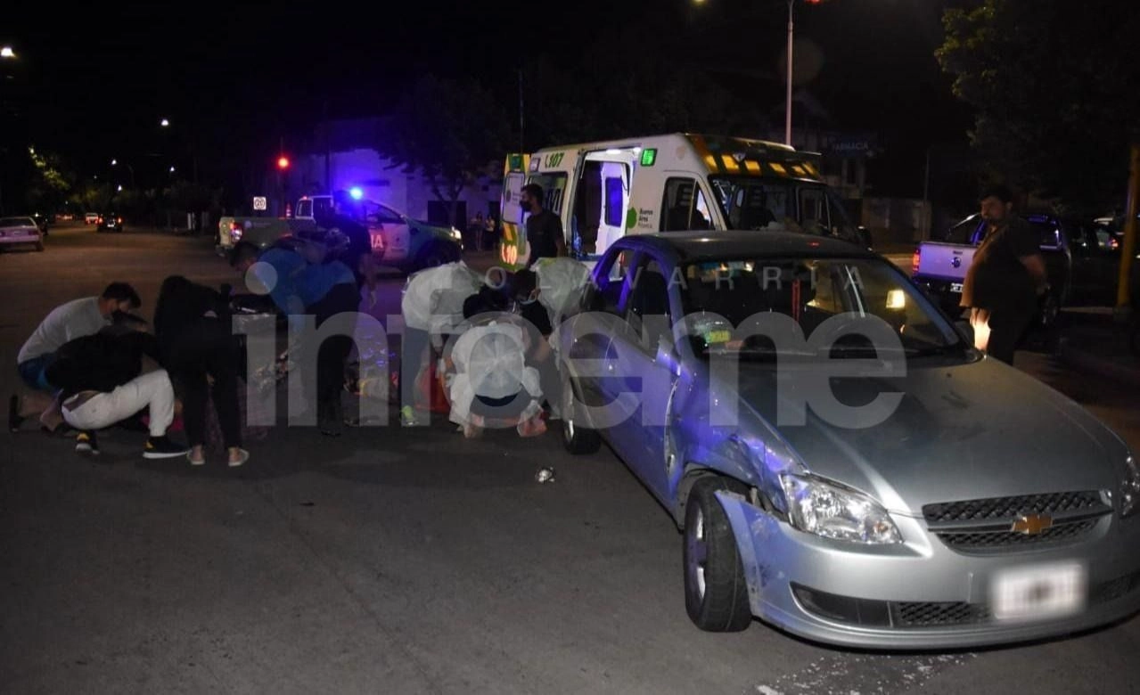 Un accidente de tránsito entre una moto y un auto se produjo cerca de las 21:30 en la intersección de la avenida Pringles y Balcarce, en el barrio de San Vicente. Producto del hecho, un hombre y una mujer quedaron tendidos en el asfalto, de acuerdo a las primeras informaciones.