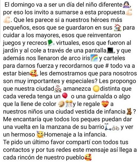 "Les propongo que nuestra ciudad amanezca distinta, que cada vereda tenga un globo o una guirnalda o algo que la llene de color y le regale a nuestros niños una ciudad vestida de infancia. Me encantaría que todos los peques puedan dar una vuelta en la manzana de su barrio y ver un hermoso homenaje a la infancia. Te pido un último favor, compartí con todos tus contactos y por tus redes este mensaje así llega a cada rincón de nuestro pueblo"